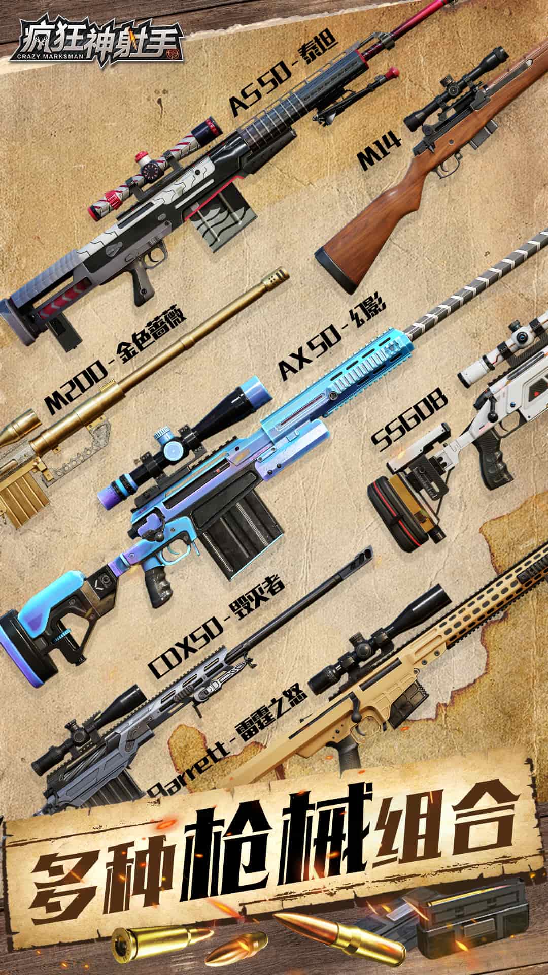2.多种枪支组合用于狩猎荒野,多种枪支组合,稀有子弹组合,免费配件组装,高级顶级狙击手。