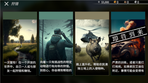 猎鹿人神枪手游戏以冒险为主题,设计了各种不同的游戏玩法和模式,玩家将在游戏中去扮演猎人的角色,可以选择不同类型不同内容的地图场景,随时选择合适的内容去进行冒险,收集游戏道具和资源,提升自己的等级和能力,解锁更多的游戏内容。去探索丛林地图,搭建自己的生存庇护所,在游戏中去解锁更多的游戏内容,选择合适的装备去进行提升,解决更多的玩家游戏问题,收集游戏道具内容。